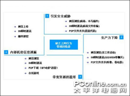 由上述现象可见,来自企业网络的内部威胁,通常都是人为因素所致,这就引出了信息安全领域的又一新发现――上网行为管理,这是信息系统安全发展史上继设备安全、数据安全之后的第三个发展阶段,此阶段的根本立足点,既不是对设备的保护,也不是对数据的加密,而是对企业员工网络行为的规范,这就提升到一个对人的管理层面的问题。