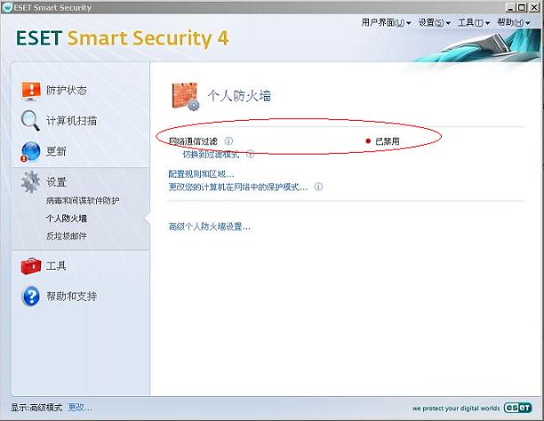 1. 在装NOD32个人防火墙主界面上,点击进入“设置->个人防火墙”,如下图所示: