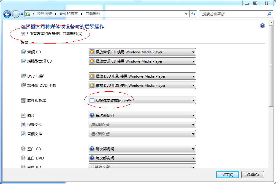 然后,在这里勾选“为所有媒体和设备使用自动播放”,并根据你要播放的光盘类型选择相应的自动播放软件;对于软件和游戏,则应该选择“从媒体安装或运行程序”,一般安装操作系统或运行光盘软件必须选择这个,然后点击保存配置,如下图所示:
