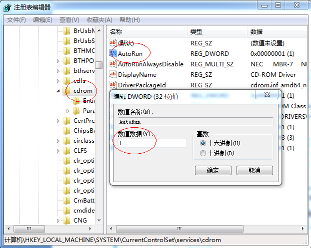 HKEY_LOCAL_MACHINE\System\CurrentControlSet\Services\CDRom,然后双击打开右侧的“AutoRun”,将键值改为1(默认为0),然后点击“确定”,如下图所示: