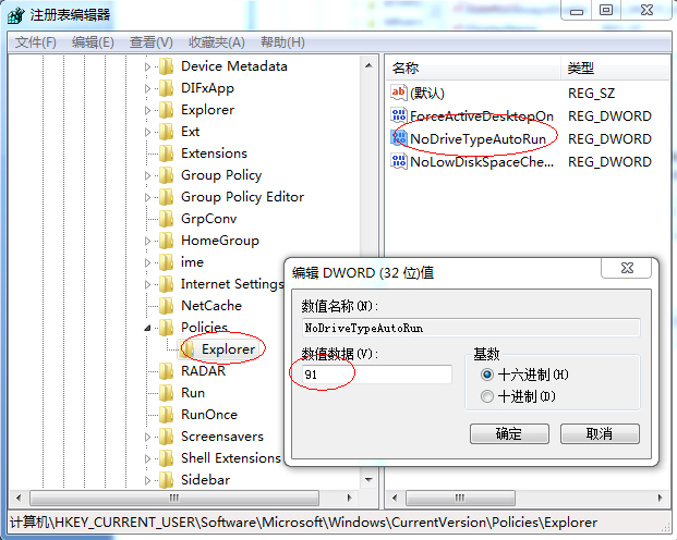 HKEY_CURRENT_USER\Software\Microsoft\Windows\CurrentVersion\Policies\Explorer,然后点击右侧的“NoDriveTypeAutoRun”,然后将其键值修改为“91”(默认为b5),然后点击确定。如下图所示: