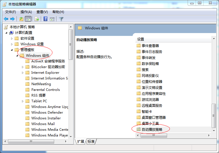 如果还无法播放,则需要检查一下组策略。方法:开始-运行-gpedit.msc,回车,然后点击“管理模板”,然后“Windows组件”,然后点击右侧底部的“自动播放策略”,如下图所示: