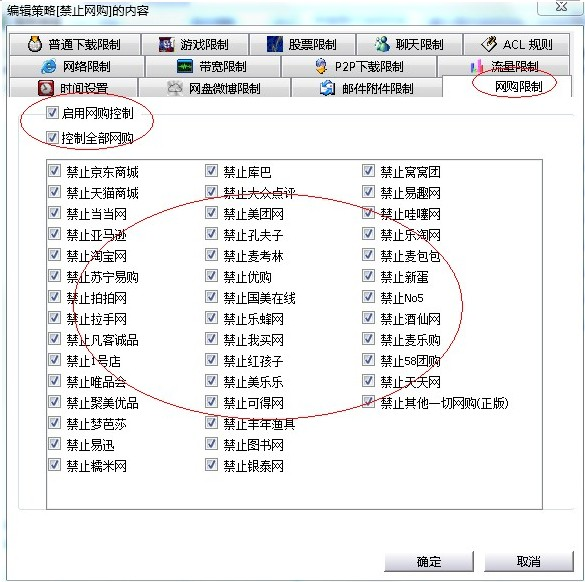 较后,可以通过部署专业的网络管理软件、上网行为管理软件来实现有效的员工上网行为管理。目前,国内网络管理领域涌现了很多网络管理软件品牌,大都具有了较为全面的上网行为管理。例如,当前国内知名的“聚生网管”(下载地址:http://www.grabsun.com/soft.html ),集成了丰富的上网管理功能,如禁止局域网P2P下载、限制局域网聊天、禁止上网购物、控制局域网玩游戏、限制局域网炒股、控制局域网网速、限制上网流量等。其中,“聚生网管”集成了丰富的购物网站限制功能,只需要点点鼠标就可以完全屏蔽购物网站、控制员工上网购物。如下图所示: