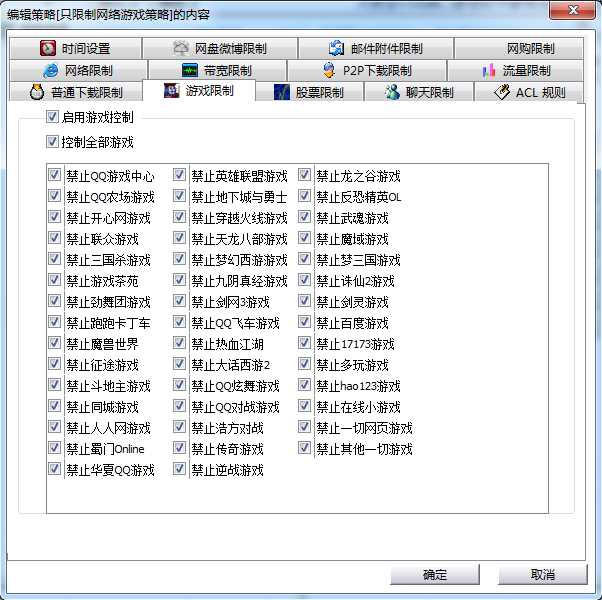 二、 配合网络管理技术手段来控制局域网玩游戏、过滤网页游戏。当前,国内出现了很多上网行为管理路由器和一些带有上网行为管理功能的防火墙,具有一定的上网限制功能。同时,路由器还大都提供了ACL访问控制规则,也就是可以通过在路由器里面添加网络游戏的端口、服务器IP地址和网页游戏的网址的方式来实现对网络游戏的控制。但是,由于一些大型的网络游戏,如QQ游戏、联众游戏、传奇游戏、征途游戏、盛大游戏、魔兽世界游戏等,服务器IP地址众多、传输端口也多种多样,同时有些传输基于加密的方式来进行。因此,通过上网行为管理路由器或防火墙上添加这些游戏端口、游戏服务器IP地址的方式就无法有效封堵了(比较有效的是屏蔽一些网页游戏、在线游戏),而必须借助于专业的上网行为管理软件来实现。