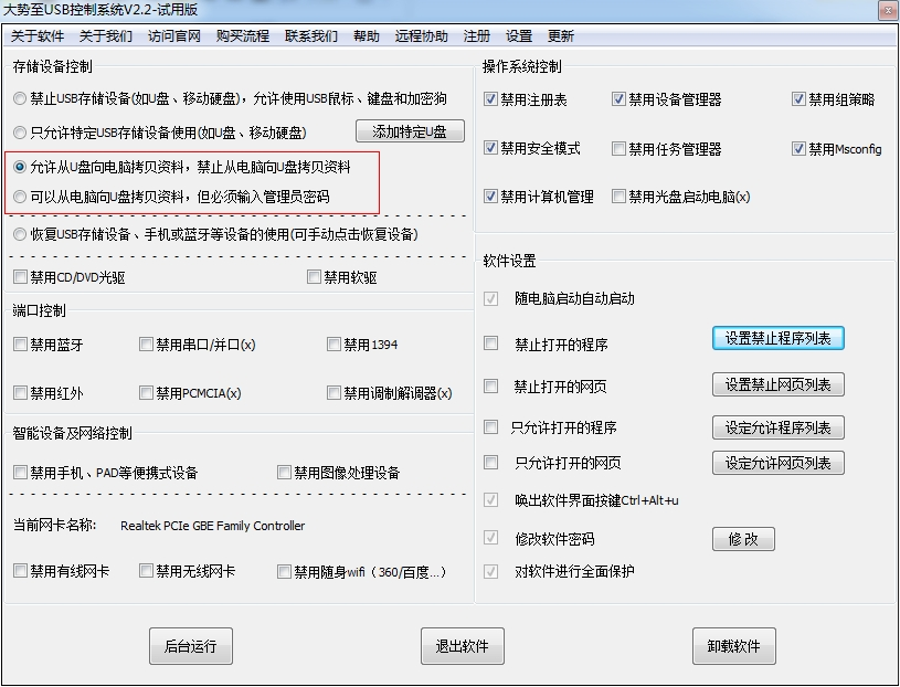 方法三、通过专业的控制U盘使用的软件,禁用U盘或限制U盘文件存储功能。目前,国内有很多的电脑USB端口管理软件。例如,当前使用较多的“大势至USB端口管理软件”(下载地址:http://www.grabsun.com/monitorusb.html ),可以轻松实现监控电脑USB端口的使用。首先,你可以完全禁用U盘、禁止移动硬盘、禁用手机存储卡,从而完全禁止U盘的使用,防止通过U盘复制计算机文件的行为;其次,你也可以通过“大势至USB端口控制软件”只是禁止从电脑向U盘复制文件,但不禁止U盘向电脑复制文件,这样既方便了文件传输,又不会导致电脑文件被复制到U盘,从而实现了更精细的管理;较后,你也可以允许从电脑向U盘复制文件,但必须输入管理员设定的密码,只有输入正确的密码才可以从电脑向U盘复制文件,否则将无法复制电脑文件到U盘,从而实现了更进一步的、更灵活的管理。如下图所示: