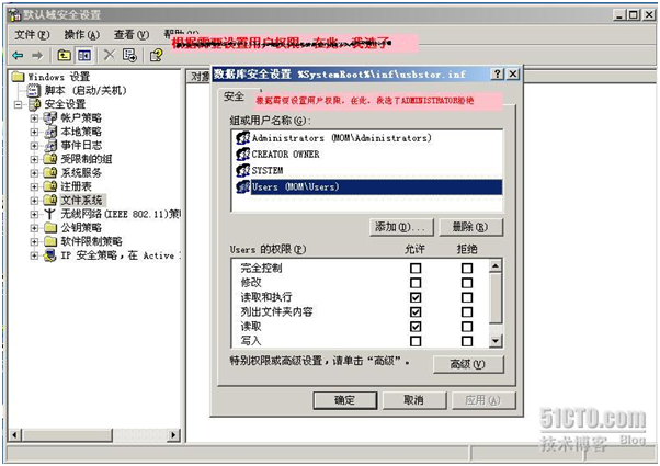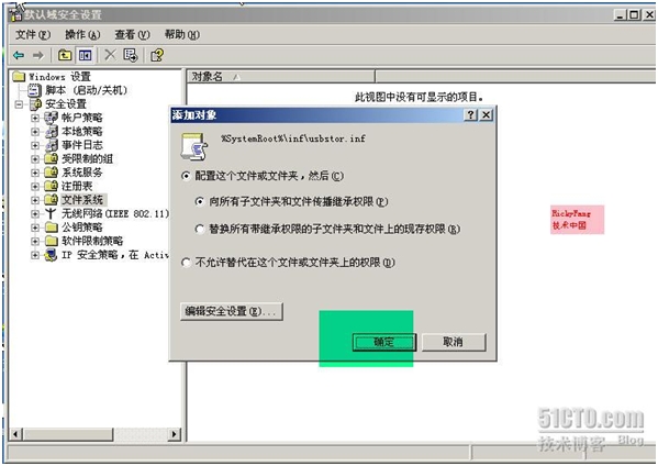 如下图,在管理工具――域安全策略――计算机配置――WINDOWS设置――安全设置――文件系统,单击右键――添加文件或文件夹。找到c:\windows\inf\usbstor.inf 和usbstor.pnf,并添加之