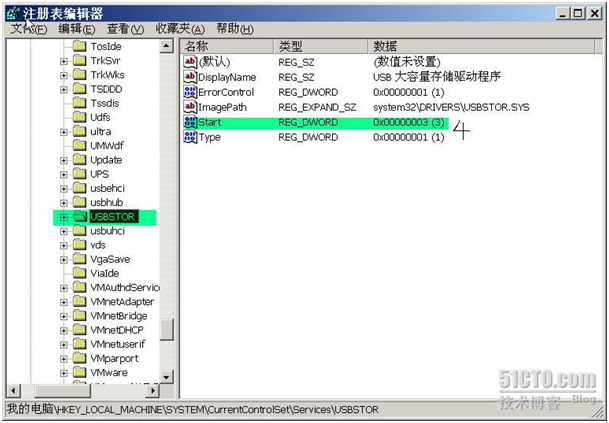 找到键值所在的注册表位置,HKEY_LOCAL_MACHINE\SYSTEM\CurrentControlSet\Services\usbhub(2000系统下)或HKEY_LOCAL_MACHINE\SYSTEM\CurrentControlSet\Services\usbstor(XP or 2K3),在对应的usbhub(或USBSTOR)分支右边子窗口中,双击一下“Start”键值,在弹出的数值设置窗口中,检查一下其中的数字是多少,如果是4,表明该计算机的USB端口使用权限已经被限制起来了;如果是3,表明该计算机的USB端口使用权限已经被启用起来了,这里确保是4!!!