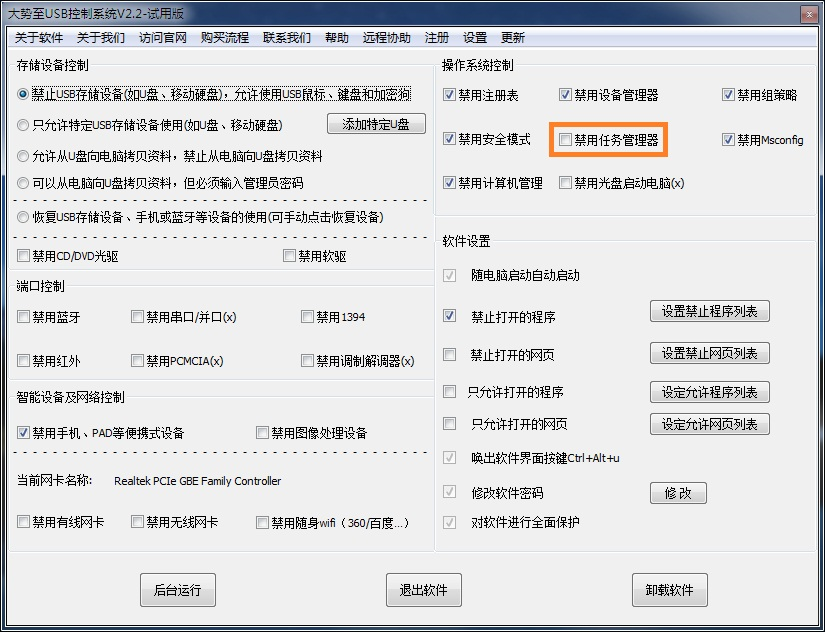 3、 打开软件主界面(Ctrl+Alt+u),选择禁用任务管理器(如下图)。