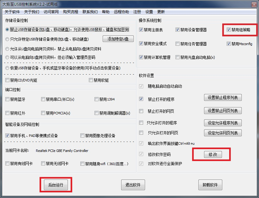 首先登陆大势至官网下载软件较新版:http://grabsun.com/monitorusb.html 并安装,在软件主界面勾选操作系统控制中的禁用组策略即可生效,然后修改软件密码并单击后台运行,这样可以保证软件不被退出或卸载(如下图)。