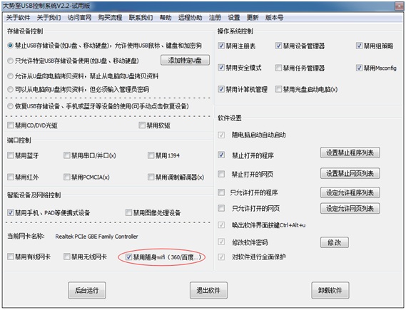 同时,在公司局域网中,员工使用各种随身wifi上网的现象也极为普遍,这些U盘大小的随身wifi由于价格便宜、携带方便而深受白领上班族的欢迎。由于这种随身wifi是基于USB端口的,那么可以通过禁用USB接口、屏蔽USB端口的方式来禁用随身wifi、屏蔽随身wifi的使用。但是,由于USB接口还经常会用到U盘、USB接口的鼠标键盘。因此,又不能完全限制USB接口的使用。那么,这种情况下,可以考虑部署一套专业的USB端口管理软件来实现。如有一款“大势至USB端口管理软件”(下载地址:http://www.grabsun.com/monitorusb.html),是一款完全禁用U盘、禁用USB存储设备、禁用随身wifi的电脑安全管理软件,但不影响USB鼠标和键盘的使用。如下图所示: