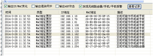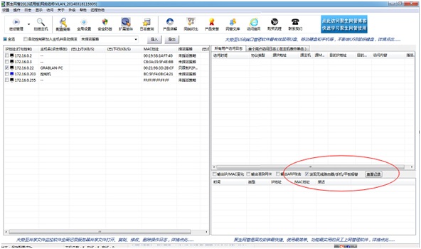 其次,可以通过部署无线局域网管理软件来限制手机上网、禁止手机接入无线局域网等。当前,国内有很多网络管理软件、局域网接入控制软件以及网络准入控制系统等都可以阻止外来手机、平板或笔记本电脑接入公司局域网中。如国内有一款在企业局域网网络管理中使用较多的“聚生网管”(下载地址:http://www.grabsun.com/soft.html)软件,可以完全控制无线局域网电脑、手机或平板电脑的上网行为。聚生网管有一个功能就是,扫描局域网手机、平板电脑,一旦发现手机后将自动输出报警信息,同时也可以还可以设置禁止手机上网、限制平板电脑上网。同时,还可以检测局域网无线路由器、禁止局域网接无线路由器、禁止使用无线路由器的行为,防止员工私自安装无线路由器为自己的手机、平板或笔记本电脑提供上网服务。如下图所示: