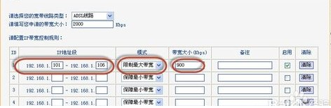 在右侧填写要限制网速的电脑的IP,模式选择“限制较大带宽”,限制网速带宽的话,如果体现合理平分的话,可以将申请的带宽除以总电脑数。如申请4M的带宽的话,4台电脑的话4000/4,一台电脑限制较大带宽为1000.