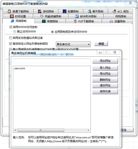 这种情况下一般是通过专业的网络管理软件、上网控制软件来实现。通常情况下,这些网络管理软件都带有某种网页白名单和黑名单功能,通过将一些网站加入网页黑名单就可以完全屏蔽网站访问的目的。例如有一款“聚生网管”软件(下载地址:http://www.grabsun.com/soft.html),带有网址黑白名单管理功能,只需要将禁止访问的网站加入黑名单,这样局域网电脑就无法再访问黑名单的网址了。如下图所示: