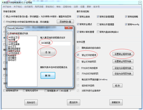 其次,通过大势至USB端口管理软件来禁用360安全卫士、360手机助手和360浏览器的使用。勾选软件界面右侧的“禁止打开的程序”,并点击“设置禁止程序列表”,然后就可以出现下面的列表框,然后你只需要在这里添加360公司相关产品,即可禁止360相关产品的安装和运行。如下图所示: