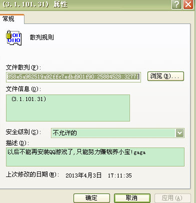 这样设置之后,不论把安装文件放到哪里,不论怎样更改这个文件的名字都不能执行的。其实这个是用散列实现的。散列规则,就是计算出一个文件或应用程序的哈希值(hash),然后,通过限制这个哈希值来达到限制这个应用程序的目的。因为每一个不同的应用程序或文件的哈希值是的,因此,不论把这个文件放到哪里,不论怎样更改这个文件的名字和后缀,散列规则依然有效。要限制一个程序,散列规则是较佳的选择。其他软件限制策略都是很容易失效的,比如,路径规则,如果把程序放到别的不受限的文件夹里面,就不能限制这个程序了。限制指定的应用程序名的方法也不完美,如果把应用程序改一个名字,就不受限了。当然了如果你想防止别人从组策略进去修改的话,你可以把组策略文件重命名就可以了,比如改成gpedit123.exe。或者删除组策略也行。