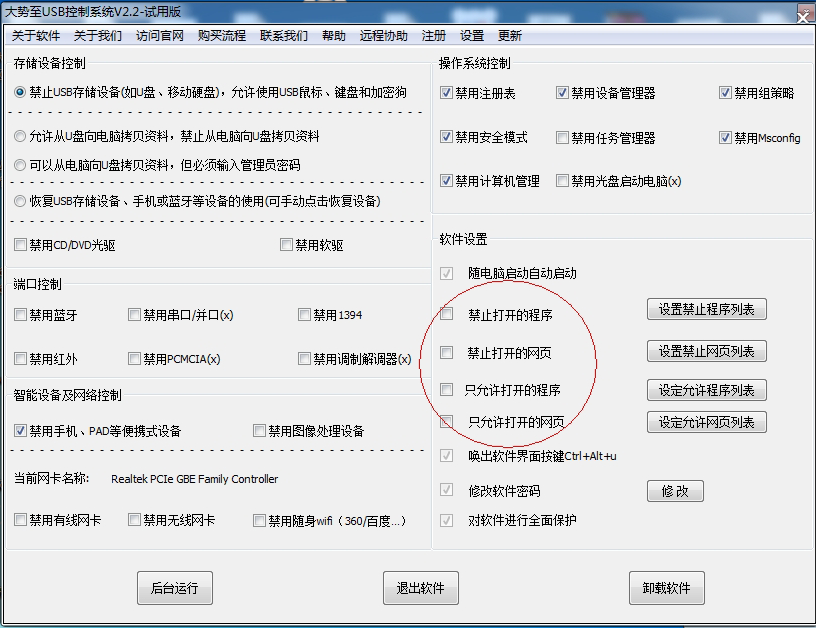 目前有一款软件“大势至USB端口控制软件”(下载地址:http://www.51wangguan.com/monitorusb.html)可以很好的实现这个功能,首先下载安装软件之后会自动在电脑后台运行,只需要勾选软件中的“禁止打开的程序”或者“只允许打开的程序”并添加程序名称到相应列表即可(如下图),其次只需要设置好密码,防止用户关闭就可以了。