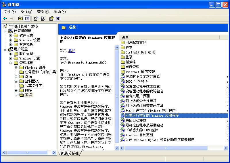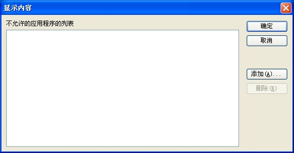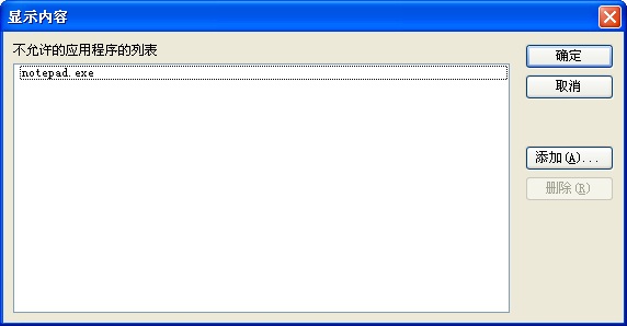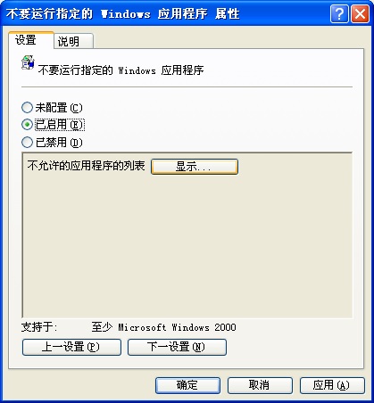 这个设置只阻止用户运行Windows 资源管理器启动的程序。不阻止用户运行由系统过程或其它过程启动的程序,如任务管理器。同时,如果您允许用户访问命令提示符Cmd.exe,这个设置不防止用户在命令窗口启动他们不能用Windows 资源管理器启动的程序。注意: 要创建一个不允许的应用程序列表,单击“显示”,单击“添加”,然后输入应用程序的执行文件名称(例如,Winword.exe,Poledit.exe,Powerpnt.exe)。