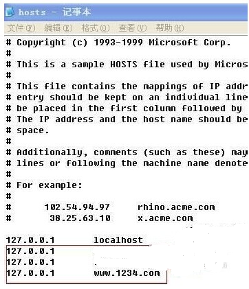 选择记事本确定之后即可打开设置屏蔽网站的文件了,我们只需要按照以下格式输入需要屏蔽的网站地址即可,如下图: