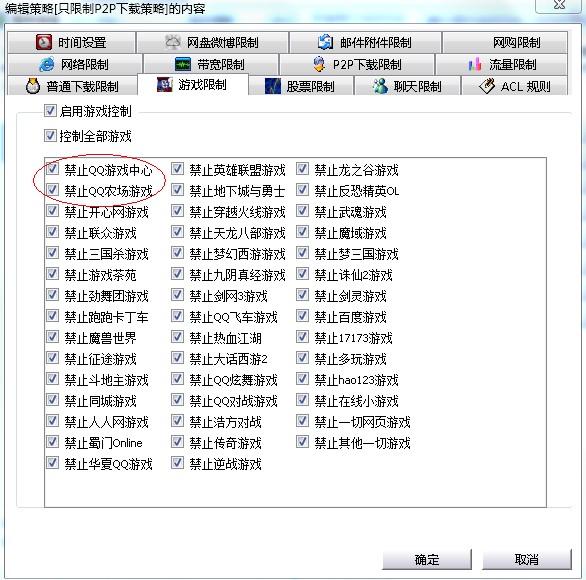 此外,聚生网管还可以限制局域网P2P下载、控制局域网玩游戏、限制局域网炒股、禁止局域网网购,同样也只需要点点鼠标就可以了,如下图所示: