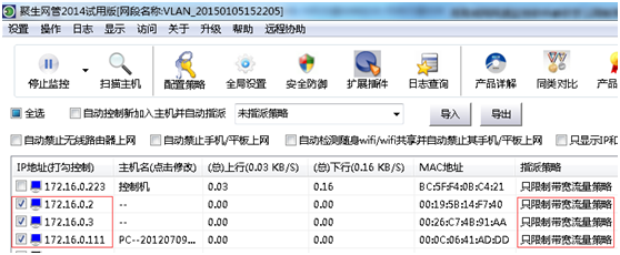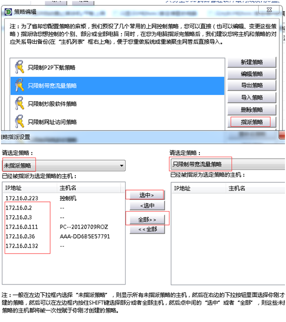 为电脑指派策略的方法也比较简单,左边选择“未指派策略”,然后出现所有未指派策略的电脑,然后用鼠标单击选中或者通过shift多选,右边选择“只限制带宽流量策略”(或者你创建的策略),然后点击中间的“选中”或者“全部”即可指派完成。这样,再去主机列表,在主机前面打勾就可以生效了。