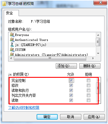 3、然后选择上js,设置一下你想对js赋予什么样的权限即可,为了省事,我这就让他完全控制了。