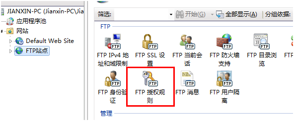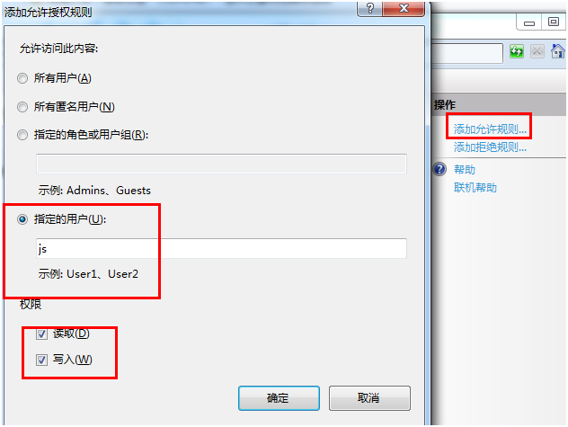 4、到这就完了么?NO,还没完呢,现在还需要去IIS中将js这个用户添加一下。上面的设置只是允许js用户对此计算机可以进行什么样的操作,但是FTP服务的设置到现在为止还没有设置一个用户可以进行写入的权限。打开授权规则,然后从右边选择添加允许规则,再设置一下js的权限,现在就可以了。