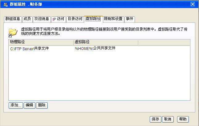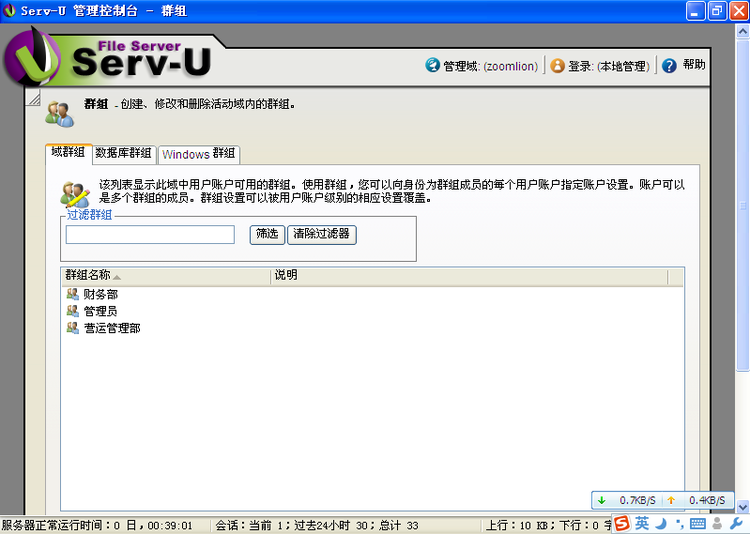FTP服务使用Serv-U提供。权限分配以部门为组群,每个部门的人处于同一个组群。同一组群的用户可以继承组群的设置。