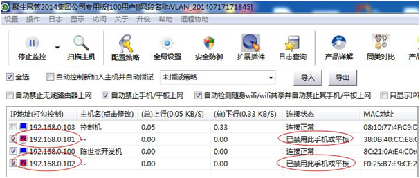 如果您的局域网是完全通过无线路由器上网的,则聚生网管一方面可以检测局域网无线上网的手机和平板电脑并可以禁止手机无线上网;另一方面也可以将手机和平板电脑当做电脑来控制,比如限制手机无线上网网速、禁止手机无线下载等。如下图所示:
