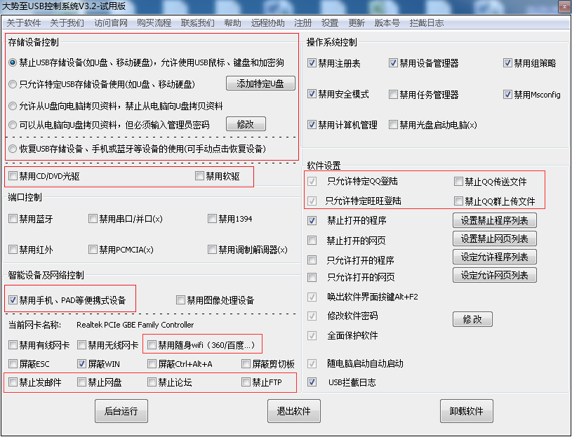 如果您觉得组策略封U口、注册表封U口的设置较为麻烦的话,您也可以借助于专门的电脑USB口禁用软件、封U口软件,通常可以有效禁用U口使用。例如有一款“大势至U口禁用软件”(下载地址: