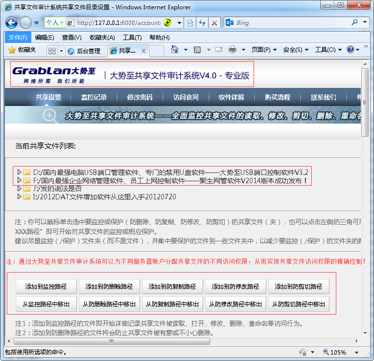 公司简介:大势至公司是国内较早的企业网管软件提供商,可以为企事业单位提供整体的企业网络管理方案和企业网络管理平台,通过全系列的公司监控员工电脑软件教你如何控制员工上网、如何控制局域网内电脑上网以及如何保护电脑文件安全等。公司核心产品“聚生网管系统”是一款专门的公司网管必备软件、查看网络流量软件、网络流量监控软件和办公室电脑监控软件;“网络特警”则是一款专门的网络流量监控设备、上网行为管理服务器、网络行为管理设备,可以实现更为强大的局域网网络行为管理;大势至USB接口禁用软件则是一款专门的数据防泄密产品、屏蔽U盘软件、电脑USB端口禁用软件,可以严防通过一切途径泄露电脑文件,保护单位无形资产和商业机密安全;大势至共享文件夹管理软件则是一款专门的共享文件权限设置软件和共享文件设置密码软件,全面保护共享文件安全;大势至共享文件审计系统则是一款专门的服务器共享文件夹设置软件、服务器共享文件访问日志记录软件,可以详细记录局域网用户访问共享文件的行为,更好地管理共享文件的安全;大势至局域网网络准入控制系统则是一款专门防止未经授权的电脑接入公司局域网的行为,防止外来电脑访问局域网共享文件、防止蹭网以及绑定IP和MAC地址,保护网络安全;大势至FTP服务器日志记录软件则是一款专门记录局域网用户访问FTP服务器日志的软件,可以有效保护FTP服务器文件安全。