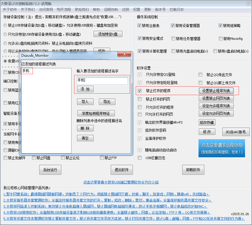 因此,可以通过大势至USB接口管理软件的“禁止打开的程序”这一功能来禁止打开此对话框,这样自然无法通过电脑QQ向手机QQ发文件的行为了。具体实现途径如下: