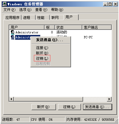 这个时候你需要注销另外一个登陆的服务器账户,然后才可以删除。方法:点击底部任务栏的“任务管理器”(或按ctrl+alt+del),然后点击到较右侧的“用户”,这个时候你会看到另外一个账号,右键点击“已断开的”账户(也即你先前登录的账户),然后点击“注销”,这样就成功关闭了你先前登录的账户,然后就可以卸载、删除管理端了。图1:切换用户桌面