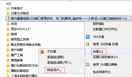 首先,由于Windows操作系统的安全考虑,使得局域网用户访问共享文件被限制只能通过匿名账户(也即Everyone)进行,而操作系统处于安全的考虑,通常也禁用了匿名账户。因此,解决共享文件夹无法访问的首要步骤就是开启Windows操作系统的匿名账户访问权限。方法如下:选择一个文件夹,然后右键点击“共享”,然后选择“特定用户”,如下图所示: