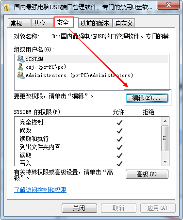 这里设置完毕之后,依次关闭对话框即可。但是,对于NTFS格式的磁盘共享文件,还必须在共享文件夹的“属性”的“安全”选项里面增加“everyone”权限。点击“安全”,然后点击“编辑”,如下图所示: