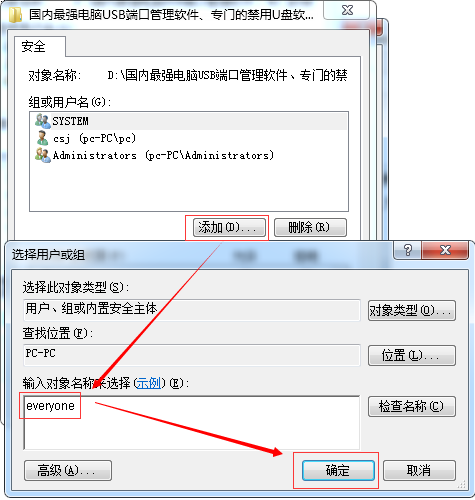然后同样点击“添加”,输入“everyone”账户即可,如下图所示: