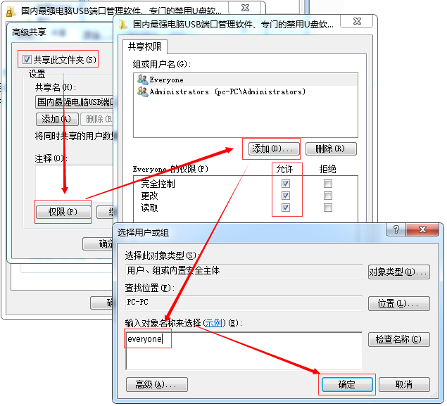 然后勾选“共享此文件夹”,并点击下面的“权限”,在弹出的对话框中点击“添加”,然后在弹出的对话框中输入“everyone”,并点击“确定”,这样就成功添加了“everyone”账户,如下图所示: