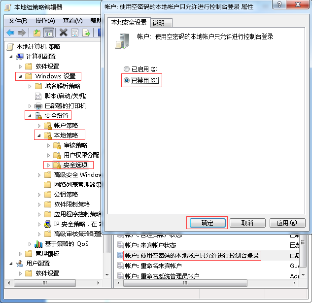 则需要开始-运行-输入“gpedit.msc”,然后这里点击“Windows设置”-“本地策略”-“安全选项”-双击“使用空密码的本地账户只允许进行控制台登陆”,然后选择“已禁用”,并点击“确定”即可,如下图所示: