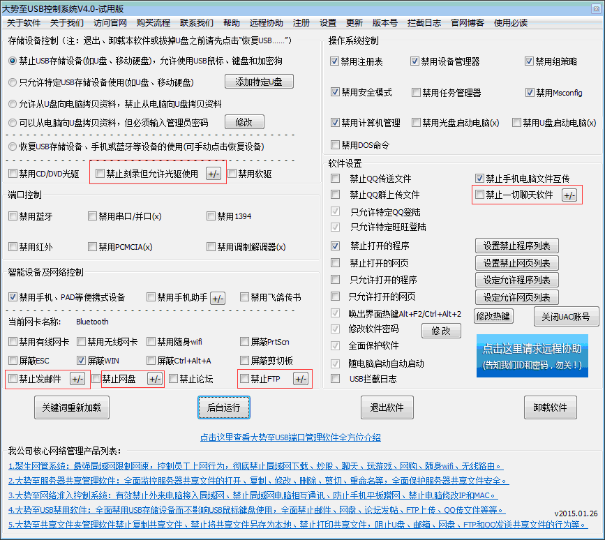4、借助于专门的电脑文件加密软件、电脑文件安全管理软件来实现。例如,有一款“大势至电脑USB端口屏蔽软件”(下载地址:http://www.grabsun.com/monitorusb.html),是一款专门禁用电脑U盘、移动硬盘、手机内存卡的软件,可以完全禁用一切USB存储设备而不影响USB鼠标键盘、加密狗和USB打印机等非USB存储设备的使用。同时,软件集成了禁止发送带邮件附件的邮件、阻止向网盘上传电脑文件、阻止FTP软件上传电脑文件到网络空间、阻止QQ传输文件。此外,软件还可以阻止电脑手机文件互传、禁止电脑文件发送到手机的行为等,从而全面保护了电脑文件安全,防止通过电脑文件泄密的主要途径泄露电脑文件的行为。如下图所示: