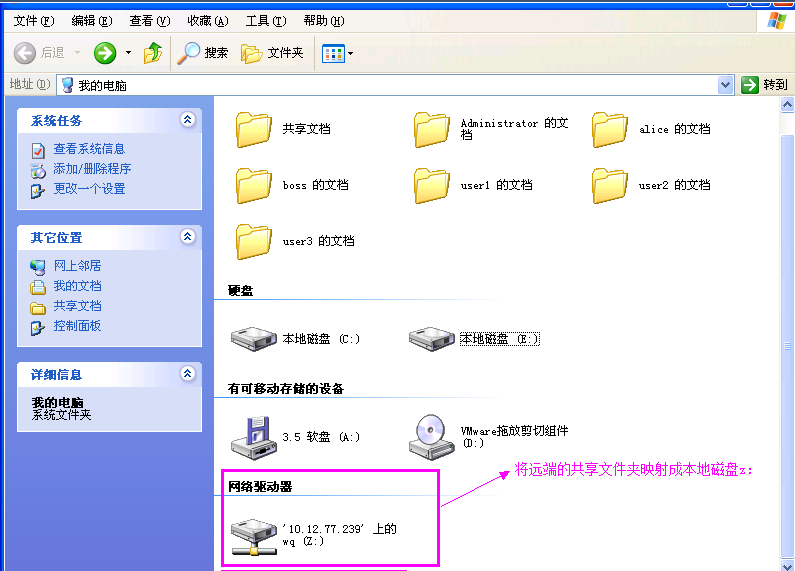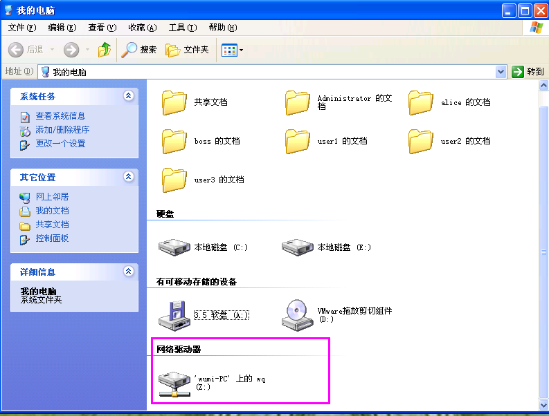 现在,在“Windows资源管理器”中的文件夹窗格中,你就可以看到所创建的映射驱动器(共享文件夹)以及你的计算机上的所有其他驱动器了。要断开网络驱动器,请在“Windows资源管理器”窗口的“工具”菜单上单击“断开网络驱动器”命令即可。