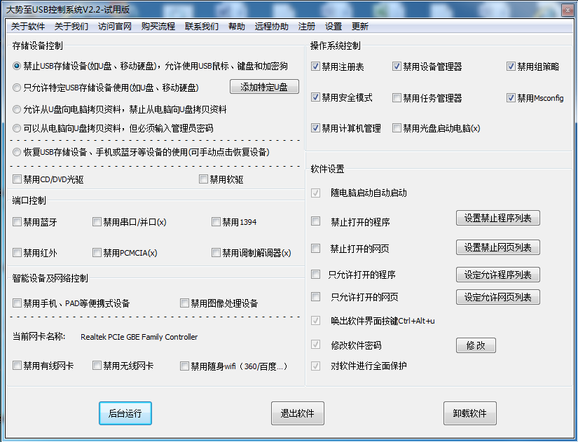 4、当然,较有效的方法还是通过专门的USB端口禁用软件来实现。例如,有一款“大势至USB端口管理软件”(下载地址:http://www.grabsun.com/monitorusb.html),只需要在电脑上安装后,就可以完全禁止U盘、移动硬盘和手机等所有带有USB存储功能的设备使用,但不影响USB鼠标键盘,同时还可以对操作系统关键位置,如注册表、组策略、设备管理器和计算机管理等方面进行保护,防止员工通过反向修改而重新启用USB存储设备的情况,从而实现了较严密的USB端口控制。此外,通过USB端口屏蔽软件可以实现对所有操作系统下电脑USB接口监控,从而扩展性更强、更有效。如下图所示: