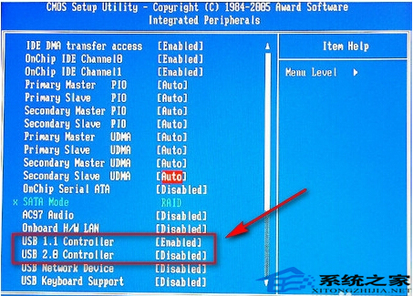 2、进入Integrated Peripherals,后我们将USB 1.1 Controller和USB 2.0 Controller按回车键打开,将其改为Disabled.