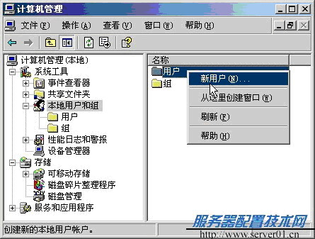 选中管理工具→计算机管理→本地用户和组,用鼠标右键单击所展开目录中的“用户”文件夹,在弹出的快捷菜单中选择“新用户”命令。