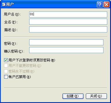 打开“新用户”对话框,在“用户名”编辑框中输入用户名。取消选中“用户下次登录时须更改密码”复选框,单击“创建”按钮完成。