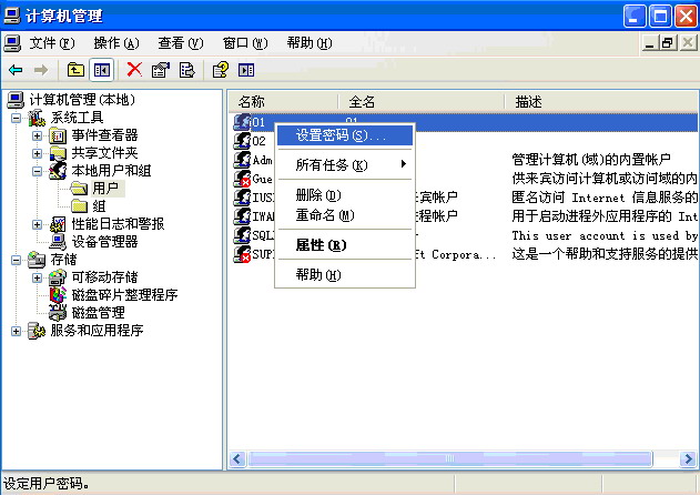 展开“用户”文件夹,用鼠标右键单击创建的新用户,在弹出的快捷菜单中选择“设置密码”命令,A计算机的每个新用户都要设置对应的密码,B计算机使用密码为空的用户名有时无法登录。