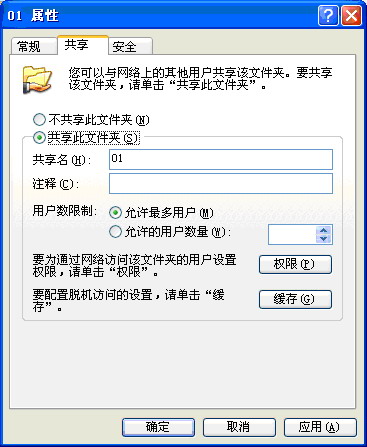 打开“01→共享和安全”对话框,选中共享此文件夹→用户数限制:该选项是限制同时访问该共享文件夹的人数限制,如果设置为10,则第11个人无法访问该共享文件夹。