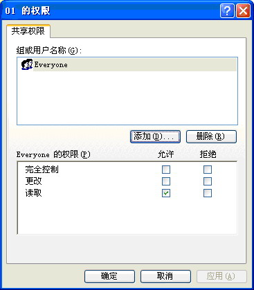 切换到“权限”按钮,保留默认的Everyone用户名,所有登录A计算机的用户都有只读权限,单击“添加”按钮。