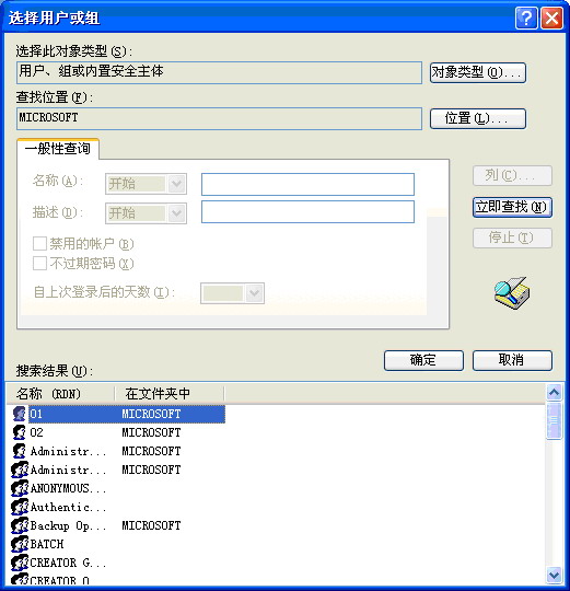 在打开的“选择用户和组”对话框中依次单击“高级”→“立即查找”按钮,在“搜索结果”列表框中选择用户(如01),依次单击“确定”→“确定”按钮。