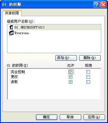 返回“01→共享和安全”对话框,在“权限”选项卡中选中添加的用户(如01),在“01的权限”列表中选中“完全控制→允许”复选框,单击“应用”按钮。