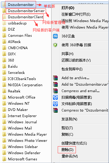 6、网络版卸载方法。客户端的卸载可以通过管理端卸载客户端,打勾选中某个或全部客户端,然后点击软件界面上的“卸载客户端”即可卸载相应客户端;管理端的卸载可以直接到安装目录(默认安装路径为C:\Windows\DszusbmonitorServer,新版本V3.1以后,默认安装路径为D:\Program Files\Dszusbmonitor)下面删除即可,如下图所示: