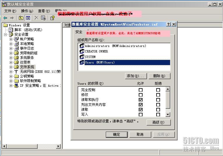 通过组策略,在管理工具――域安全策略――计算机配置――WINDOWS设置――安全设置――文件系统,单击右键――添加文件或文件夹。找到c:\windows\inf\usbstor.inf 和usbstor.pnf,并添加之